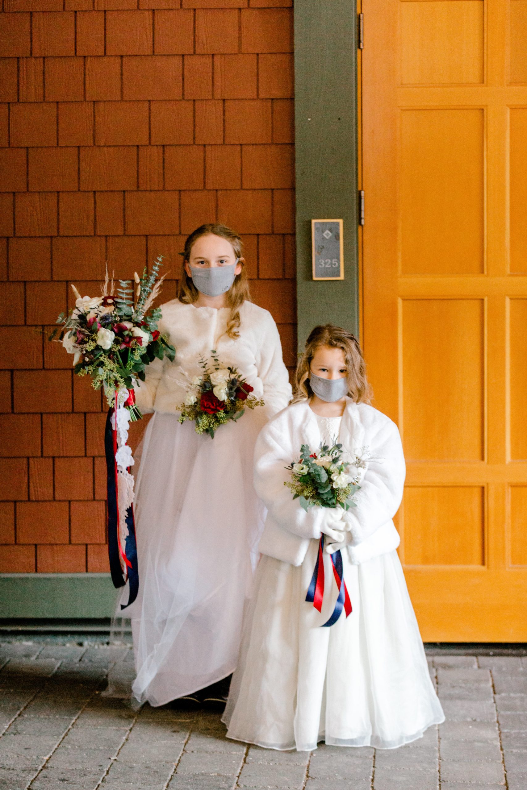 Due to covid regulations in place, a formal wedding reception was not possible. However, we enjoyed a lovely socially distanced dinner in the AURA private dining room of the Nita Lake Lodge along with our family. As wedding receptions were not allowed due to the pandemic, decorations were not allowed either. So, I worked with the hotel to repurpose florals from the wedding ceremony for the dinner tables while also incorporating custom-made activity guides for the flower girls.