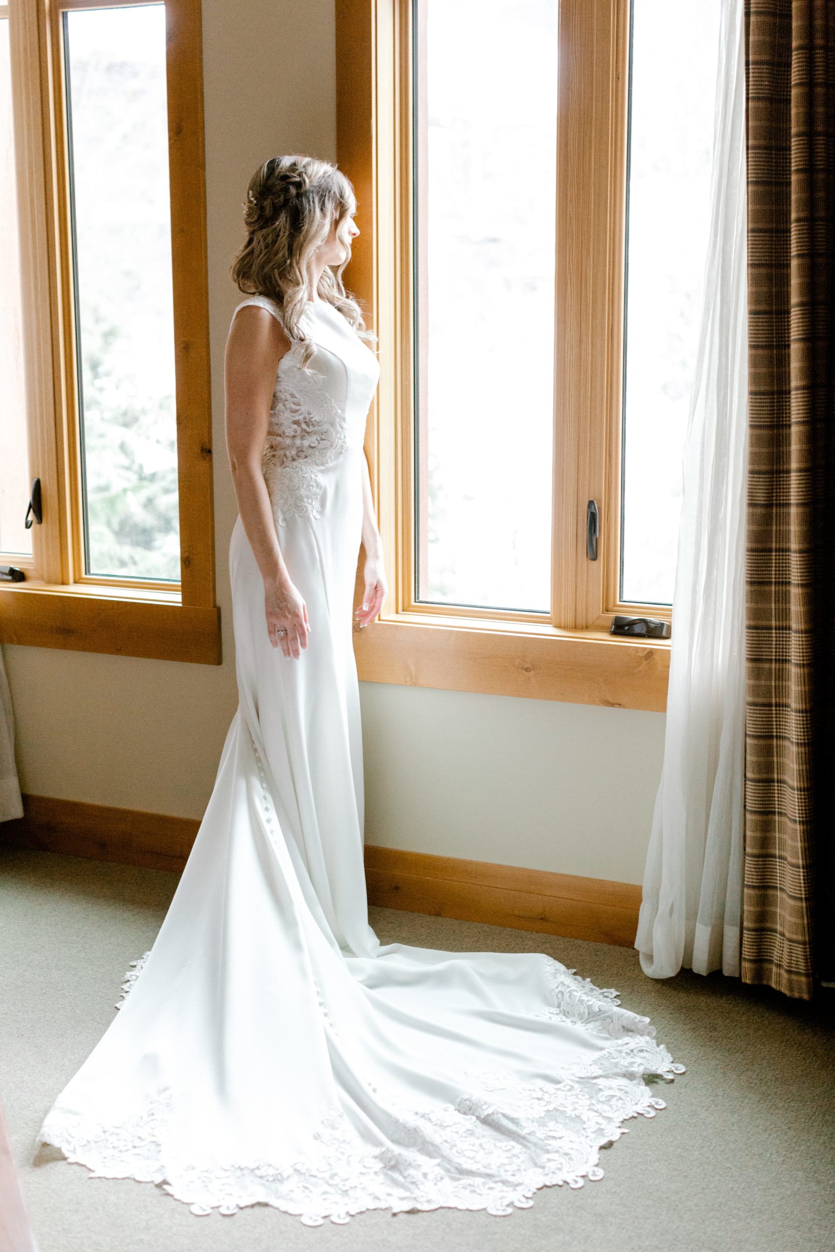 On the wedding day, I got ready in a beautiful lake view room at the Nita Lake Lodge. All vendors followed provincial healthy and safety guidelines that were in place at the time. Natacha Trottier did hair and make-up for the girls while the boys headed out onto the lake to test the ice.